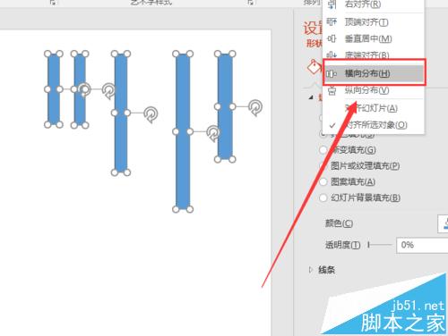 8、然后我们就是调整我们图形的分布了,这里我们分布图形来说,也就是调节各个图形之间位置,因为我们自己排的图形,肯定都是有一些误差的,所以如果我们选择分别的话,就非常的均匀了。这里如果是竖直图形就点击横向分布。水平图形就点击纵向分布就可以了。