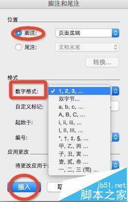 2、更改脚注的时候,一定注意数字格式,因为很多论文规范是要求写成【】的形式的,我们可以在数字格式当中更改,然后点击插入即可。