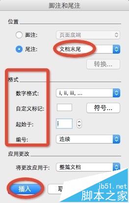 3、更改尾注的时候,注意全部的格式,因为这个每个地方要求不同,大家按照要求来更改就好了。设置完点击“插入”即可。