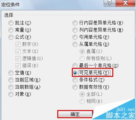 4、在定位条件对话框中选择:可见单元格,单击确定。