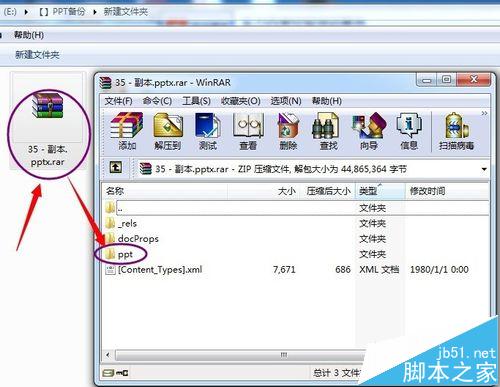 1、首先给PPTX文件复制一个备份。把备份的文件后缀名PPTX改为RAR,把这个PPTX文件当做一个压缩包文件。