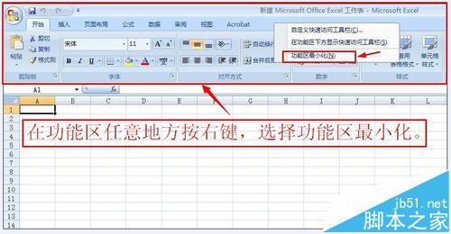 1、在功能区任意地方按右键,选择“功能区最小化”。