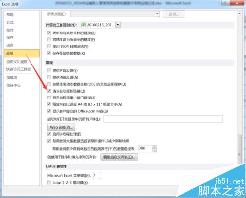 2、然后选择“高级”找到“请求自动更链接”把勾选去掉,然后确定,重新启动Excel。