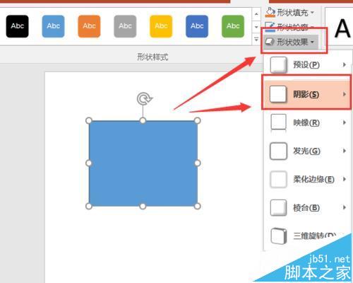 4、这里我们先说说阴影的设置,这里我们点击形状效果,然后会弹出一个选择框,这里我们点击阴影。在这界面我们可以看到很多很实用的工具,都是我们平时经常使用到的。
