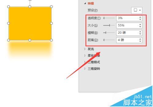 6、这里我们可以看到阴影的调整选项中可以选择的就是透明度、大小、模糊度、角度、距离,我们分别对其经行调整就可以了,让我们对图形形状效果达到我们要求的效果就可以了,这样我们再关闭这个窗口就可以了。