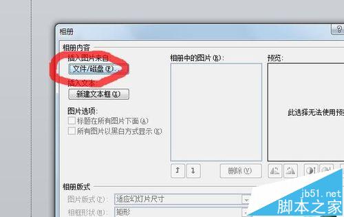 2、在弹出的“相册”对话框中,点击“文件/磁盘”按钮,全选需要插入的图片,并点击插入。
