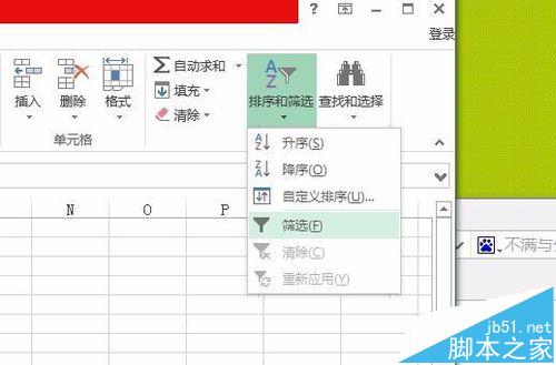 3、在打开的排序和筛选下拉框内选择【筛选】,数据的第一排即可进行筛选操作了。