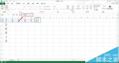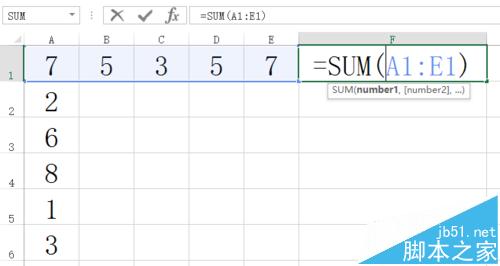 1、如果对excel表格插入函数的命令比较了解,也可以直接在excel输入窗口内输入自动求和的命令,比如=SUM(A1:E1),这个命令代表的意思就是求第一行A列到第一行E列的数字和,如下图所示。