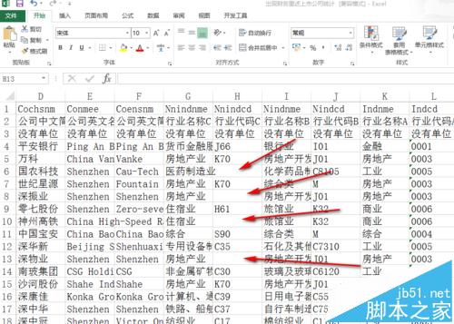 1、本文以excel2013为例来说明、。下面以一个例子来说明。如图所示在K列的“行业名称A”一列里,我们要删除所有含有“房地产”的单元格所在的行。下面说步骤