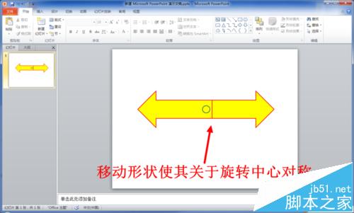 13、此时我们需要的效果就实现了,播放一下看看效果吧。这种方法的核心就是复制一个相同的形状,将其设置为透明,然后组成一个新的图形关于旋转中对称,我们看到是图形绕着非中心旋转,实际是另一个图形绕着中心在旋转。