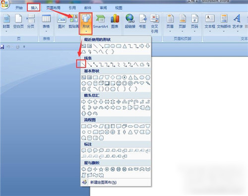 2、在word里面也有,我们打开软件,新建一个文档,点击插入功能以后,再用鼠标在插功能栏下面形状工具。点击形状工具会出现下拉菜单,在下拉菜单上面的线条工具里面点击直线工具;