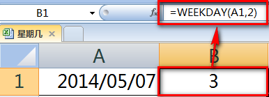 双击B1,输入函数:=WEEKDAY(A1,2),将返回2014年5月7日在一个星期中的序号为3。第二参数为2表示一周以周一为第一天。