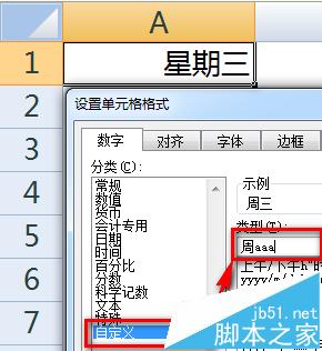 选中A1,鼠标右键,选择【设置单元格格式】,在【自定义】中输入“周aaa”,这样A1单元格将返回如“周三”这种表示方式。