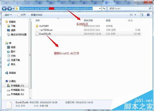 2、解决方法:Windows7系统打开路径“C:\Documents and Settings\用户名\AppData\Roaming\Microsoft\Excel”用户名是你当前登录机器的名称,删除“Excel15.xlb”文件,