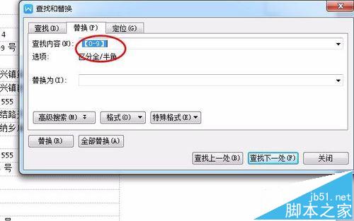 2、这个时候我们使用替换和查找,Ctrl+H或者是右上角的查找按钮都是可以的。在查找的内容里面输入:[0-9]