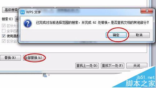 4、这个时候点击全部替换就可以了,弹出提示,我们点击确定就可以了。注意一个问题就是替换输入的是英文的[]的框。
