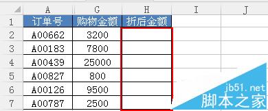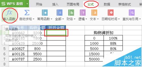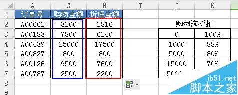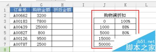 2、在空白单元格中编辑“购物满折扣”(注意“购物满折扣”的数据必须按照升序排列)。如下图