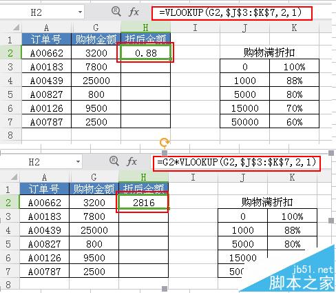 5、这时我们对函数参数进行设置(注意这时的选择“购物满折扣”要加上绝对引用),设置完成点击“确定”,这时就计算出G2的金额可以按照88折计算。如下图