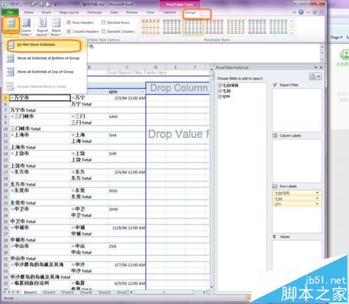 3、现在我们开始整理透视出来的结果,让其看起来更直观整洁。需要把分类汇总去掉。在数据透视表里单击任意单元格,在菜单列出现“设计”选项卡,单击设计------布局里面的"分类汇总'倒三角号-----不显示分类汇总。