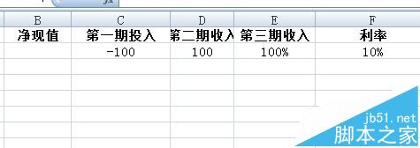 1、录入数据。NPV的计算需要三个变量,分别是每期现金流(可为正数也可为负数)、期数(可为日、月、季、年)、利率(可为日、月、季、年)。如图所示,第一期投入为100,后两期收入为100,期数为3,利率为10%。