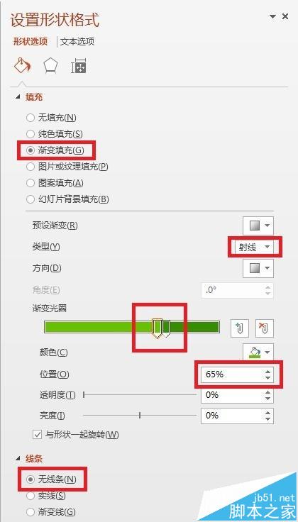 14、接着设置颜色,填充为渐变填充,类型为射线,渐变光圈设置两个色标,第1个色标:颜色为RGB(104,200,4),位置为65%;第2个色标:颜色为RGB(42,117,8),位置为70%;线条为无线条。