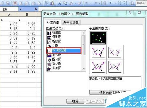 1、打开有样本数据的Excel文件,点击“插入”—“图表”,这样就打开了图表向导,然后在图表向导中选择“散点图”,再点击下一步。如图1所示。