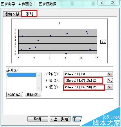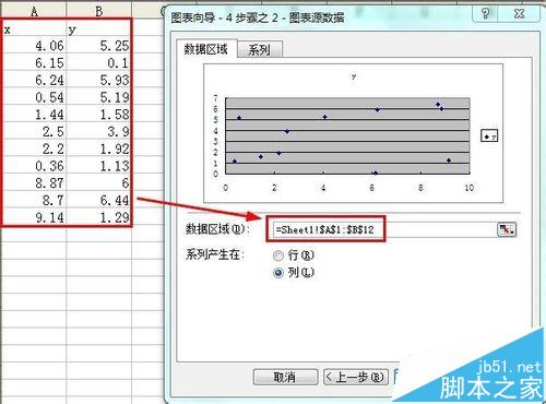 2、选择图表的源数据。这里点击“数据区域”末尾的按钮,可以把样本数据选入。如图2。如果自变量(X值)和因变量(Y值)在坐标系中颠倒,那么还可以通过“系列”来调整,具体可以见图3。