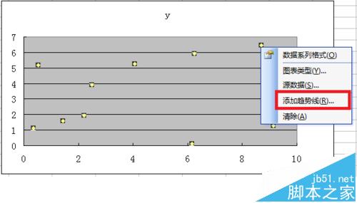 4、所有设置完成后就生成了一幅散点图,然后在散点上右击,选择“添加趋势线”。具体如图5。