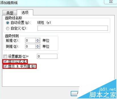 5、在添加趋势线的选框中,有一个“类型”,这里我们就选择第一个“线性”,如图6;而在“选项”里面,我们选择“显示公式”和“显示R的平方值”,如图7。