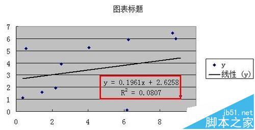6、这样在散点图(图8)中,我们就可以看见一个公式和R值。这个公式表示的是这些散点的拟合线函数,而R值表示散点数据的线性相关性。