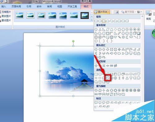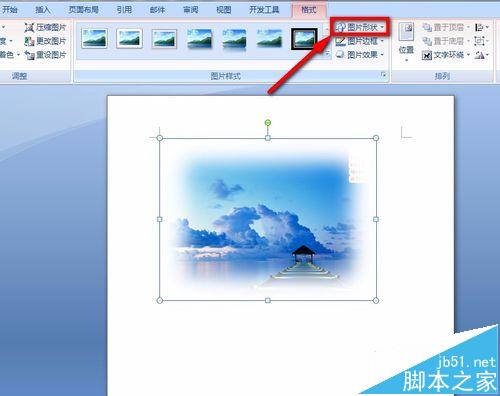 7、找到菜单栏上的“图片形状”的选项,如下图所标示的地方,点击进行。