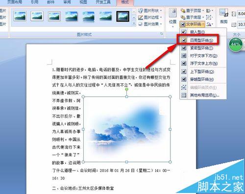 10、点击菜单栏上的“文字环绕”选项,然后在弹出来的选项框内找到我们所需要的环绕方法,如下图所示: