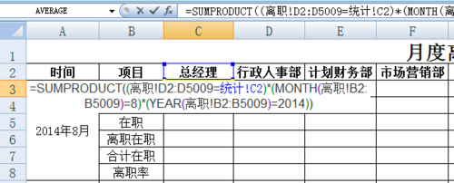 4、选中C6单元格,输入“=SUMPRODUCT((离职!D2:D5009=统计!C2)*(离职!N2:N5009<=DATE(2014,8,31))*(离职!B2:B5009>=DATE(2014,8,31)))“,回车即可直接生成总经理(部门)2014年8月在职现已离职的人数;依次在D6至L6单元格输入对应公式;求和即为2014年8月在职现已离职的人员总数。