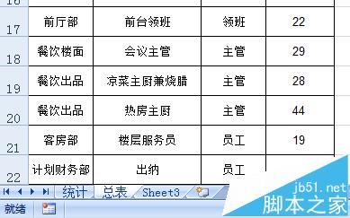 假设我们在同一个工作薄中建了一张新的工作表“统计”,跨表统计。其中所有人员信息在工作表“总表”中。