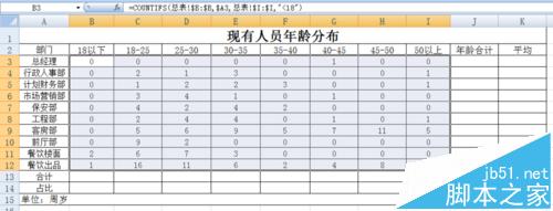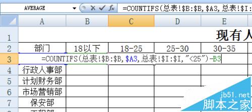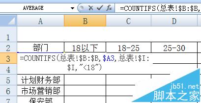 备注:总表!$B:$B指的是“总表”的B列,$A3指的是本张工作表的A3单元格即“总经理”,"<18"意为总表B列中是“总经理”部门的年龄小于18周岁的人数。