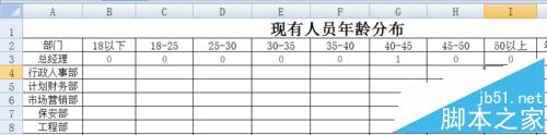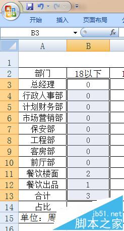 6、B3至B12自动求和,即可得出年龄18岁以内的合计人数,依次类推可得出各个工龄段的人数分布。占比即各工龄段人数占总人数的比例(如B14单元格输入公式“=B13/SUM(B13:I13)”即可,依次类推)。