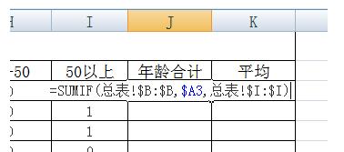 7、选中J3单元格,输入“=SUMIF(总表!$B:$B,$A3,总表!$I:$I)”,回车即可直接生成总经理(部门)所有人员的年龄合计值(和)。下拉公式至12行。部门人员的平均年龄则为部门年龄合计值除以人数即可得出平均值。