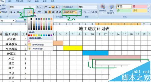 2、然后,根据数据内容把表格的数量勾勒出来,合并单元格,并用不同的色块填充,