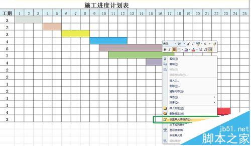 4、下面我们就把进度条设计成实时跟进工程进度的进度条。按住ctrl键,把所有进度框选择起来,右键,设置单元格格式,将单元格属性调成百分比格式;然后,保持所有进度框选择情况下,在工具栏里“条件格式”下选“数据条”下面的一种喜欢的样式。