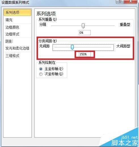 4、在弹出的来的设置绘图区格式对话框中,可以看到第一个系列选项中的分类间距