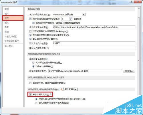 5、在下方找到“将字体嵌入文件”,将其前面打勾,确定。在其下方有两个选项,第一个是嵌入字体,别人能看到自己的字体样式,但是不能编辑,适于减小文件大小;第二个也是嵌入字体,但是别人不仅能看到字体样式,而且还能够编辑,但因此也使得文件比较大,因此可根据需要进行选择。