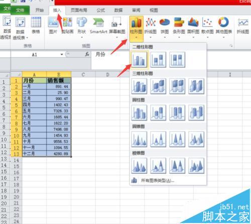 1、选中数据源,这里是A1:B13,在菜单中选择“插入选项卡——柱形图——二维柱形图”