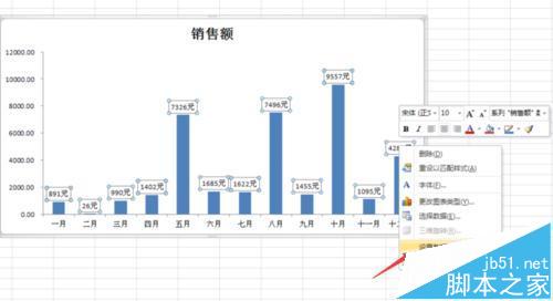 3、此时在柱形上方会显示销售额,现在我们需要在销售额后面添加单位“元”,右键单击数据标签,选择“设置数据标签格式”