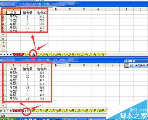 1、如下图所示工作薄中包含12个月的工作表,每个工作表中显示的是当月的各种车型的销售额和销售量的数据,