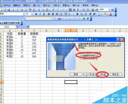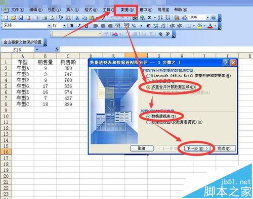 2、点按命令栏数据命令,在弹出的菜单中点按数据透视表和数据透视图命令,在弹出的数据透视表和数据透视图向导3步骤之1中点选多重合并计算数据区域,然后点选数据透视表,然后点按下一步,在下一个对话框中点选创建单页字段,然后继续点按下一步