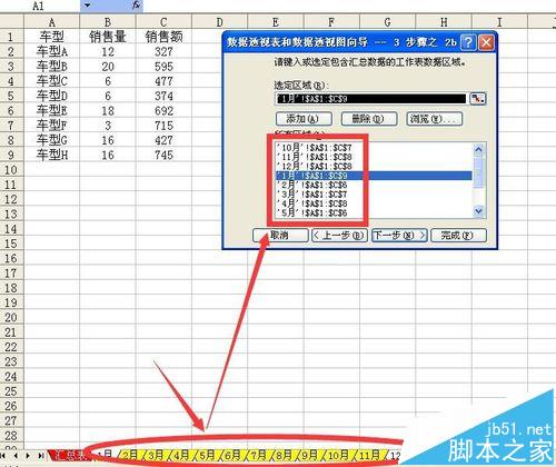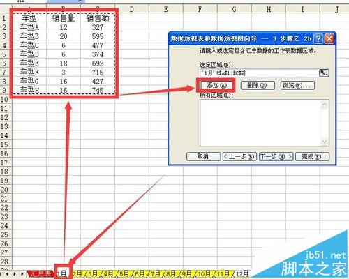 3、在接下来弹出的数据透视表和数据透视图3步骤之2b中点按一月工作表标签然后选择该表中如图所示的数据区域,然后点按添加按钮,将所有的12个工作表中的数据区域均添加完成后检查一下添加区域的顺序,然后点按下一步,然后在数据透视表和数据透视图向导3步骤之3中点选新建工作表,然后点按完成。