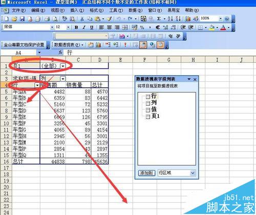7、然后将列字段拖动到行字段车型的右侧作为车型的下级字段,下面的第二个截图是拖动后的效果,将列对应的字段名通过双击更改为项目。