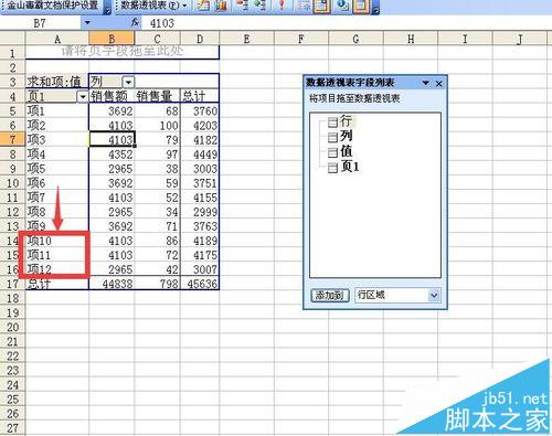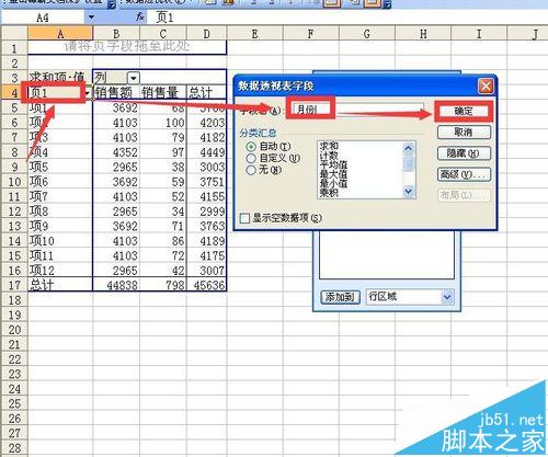4、这是新建好的数据透视表,首先将行字段拖走,然后将页字段拖动到行字段的位置,通过拖动单元格边缘将项1到项12重新按顺序排列,通过双击页字段所在单元格调出数据透视表字段对话框,将该字段名改为月份,然后将月份字段下的每个项目改为相应的月份,然后通过拖动单元格边框将月份从1月排到12月。