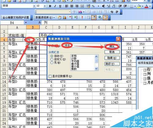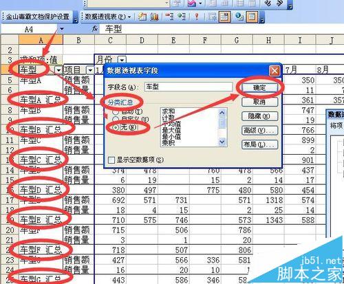 8、通过双击车型字段,在弹出的数据透视表字段对话框中点选分类汇总下的无,然后点按确定,将该字段的分类汇总删除掉,下面的第二个截图是删除了该字段分类汇总后的显示效果,