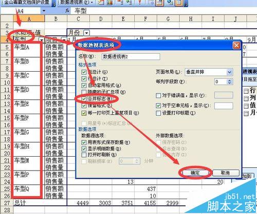 9、车型下的各个车型对应着下级字段销售量和销售额,需要将车型居中显示这样看起来会美观一些,右键点按车型字段,在弹出的菜单中点按数据透视表选项,在弹出的菜单中勾选合并标志,然后点按确定,下面第二个截图是设置完后的效果,可以看到对应的车型已经居中显示了。